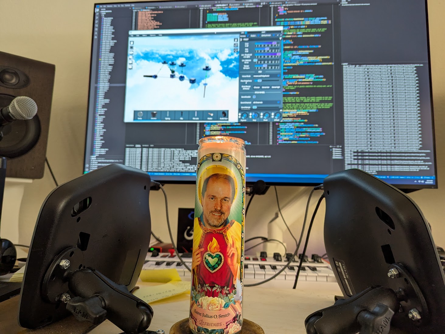 Pretty early in those 3 years, I started referring to Julius as one of the Patron Saints of Anukari. Anukari now has several patron saints, but as far as I remember, Julius was the first. Evidently I enjoyed joking about this enough that Julius O. Smith III became a household name, at least in my household, which is to say that my wife Meg was aware of his name.