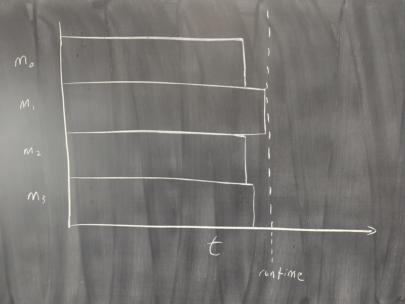 This diagram shows the runtime of several machines, where one has been assigned much more work than the others: