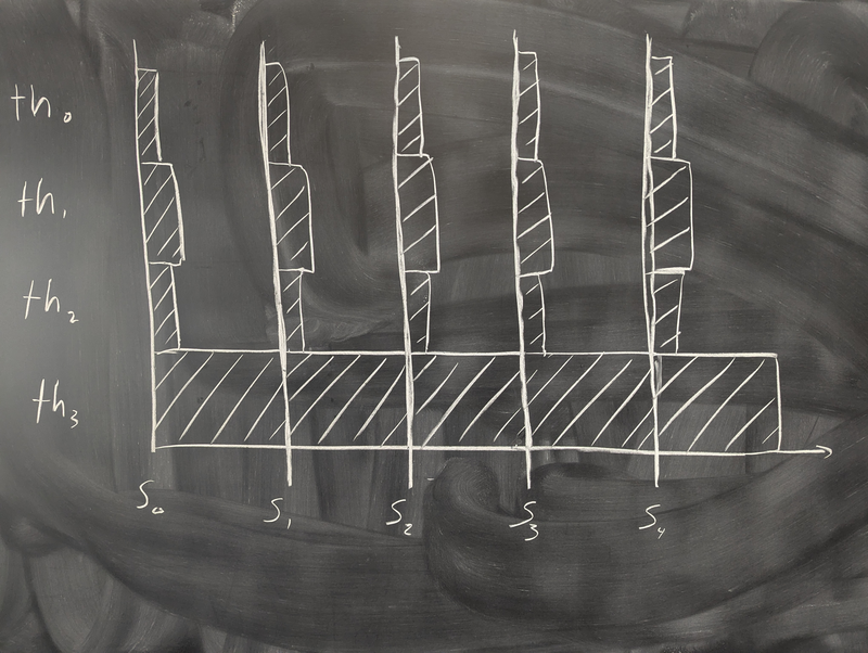 The diagram below shows the timeline for several threads, where one thread has much more work than the others. At each time step, most of the threads finish early and wait idle until the slowest thread is ready to begin the next cycle: